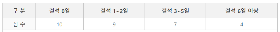 고교출석률 : 아주 다행히도? 대학출석률이 아니다. 고등학교때는 어떻게 학교는 다 다녔으니 10점