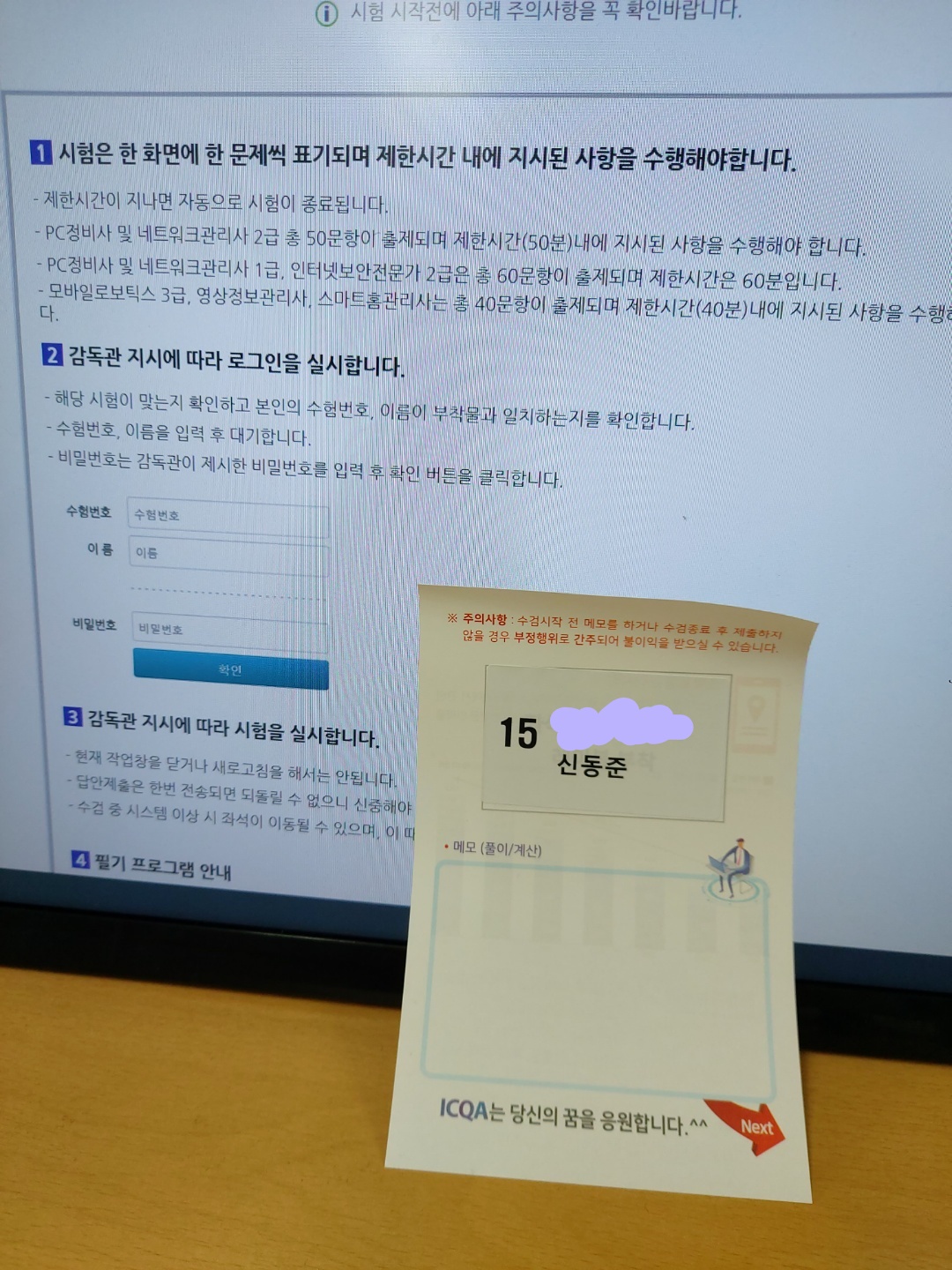 시험은 컴퓨터로 봤는데 사이트 접속해서 수험번호랑 현장 공개되는 비밀번호를 넣고 4지 선다로 객관식이었다.