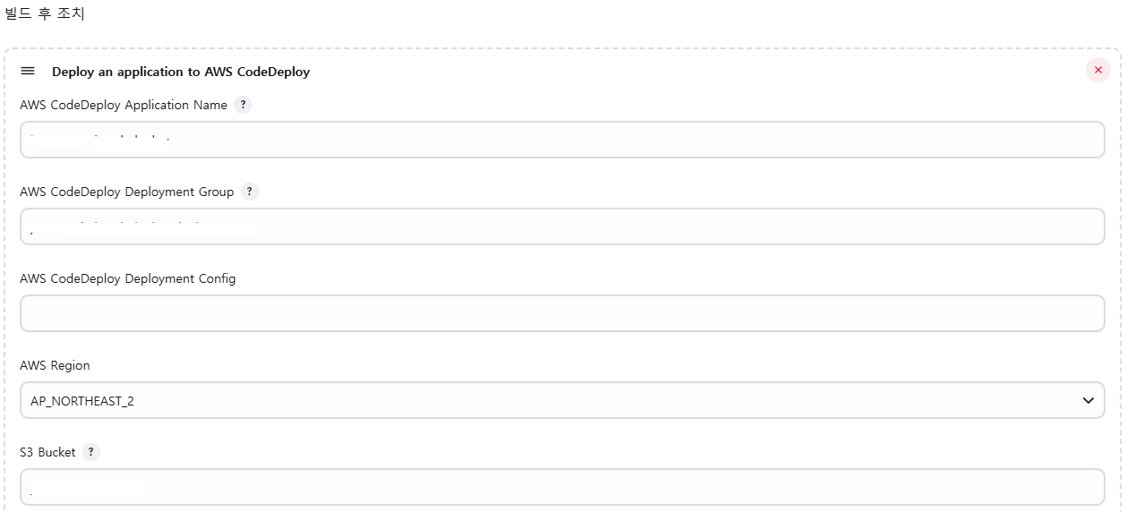 5. 빌드 후 조치 > AWS CodeDeploy 선택 후 아까 만든 CodeDeploy 애플리케이션 이름, 배포 그룹, 배포 리전, S3 버킷 명을 입력해 줍니다. (원한다면 include 할 폴더를 지정할 수 있습니다)
