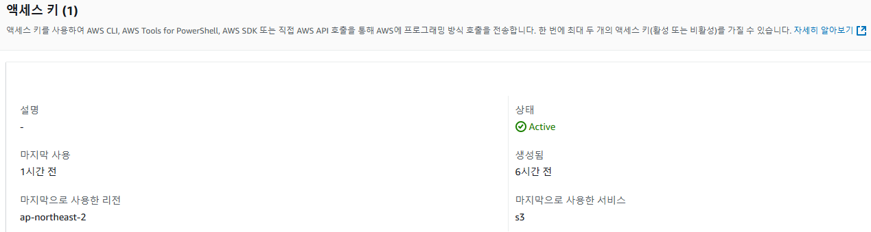 자격증명으로 액세스 키를 만들고, Access/Secret Key를 잘 기록해 둡니다.