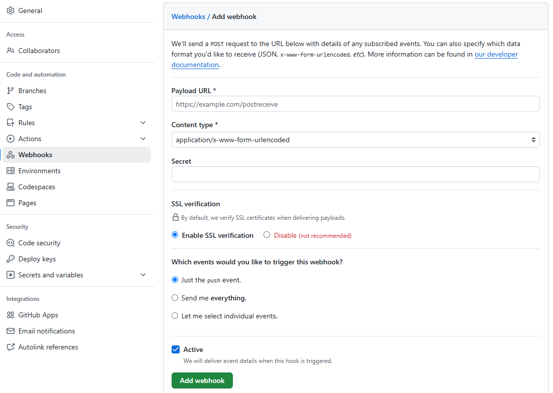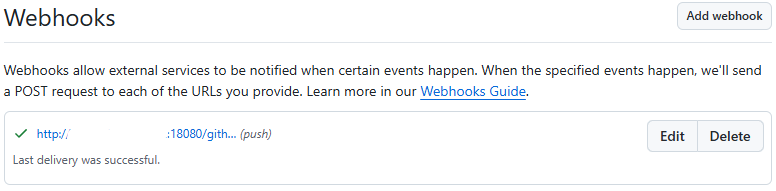 Github repository > Settings > Webhooks에서 새로운 webhook을 생성합니다.