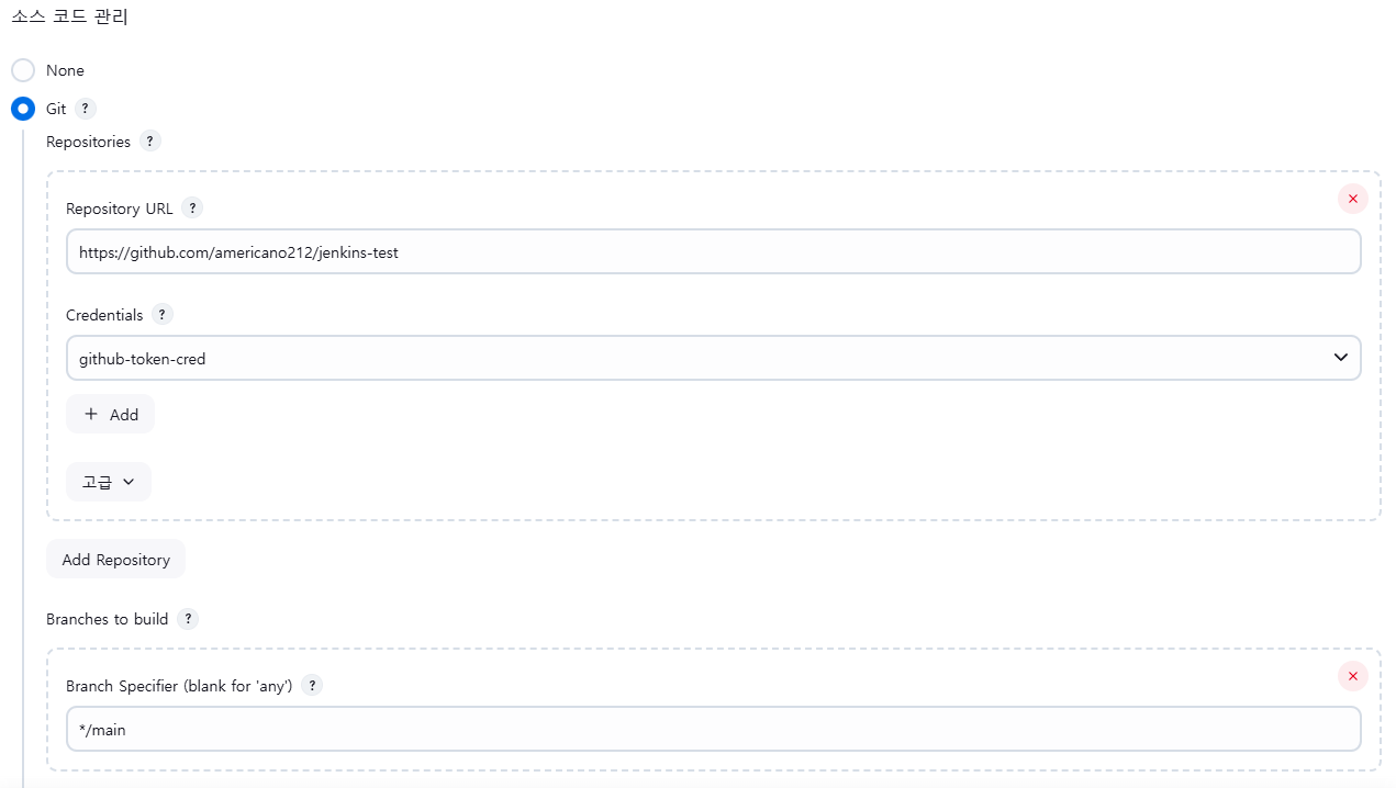 2. 소스 코드 관리 > Git 선택 후 URL, Credentials, Branch 입력