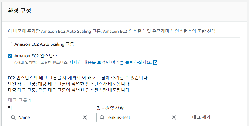 3. 환경 구성에서 EC2인스턴스를 선택하고 Name 키로 아까 만든 EC2의 value를 선택합니다.