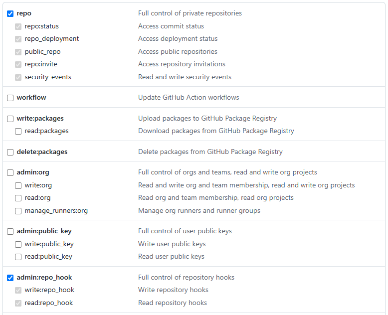 Github에서 토큰을 발급받아줍니다. 이때 권한은 아래와 같이 넣어주면 됩니다.