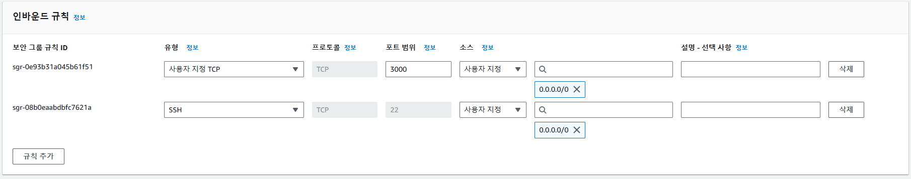 4. 보안 그룹은 nest.js 기본 포트인 3000 포트와 ssh 접속을 위한 22 포트를 개방합니다.
