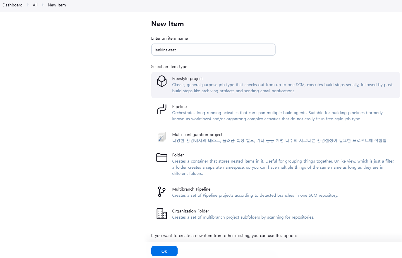 메인화면에서 New Item을 누르고 원하는 Item 이름을 넣은 뒤 Freestyle project를 생성합니다.