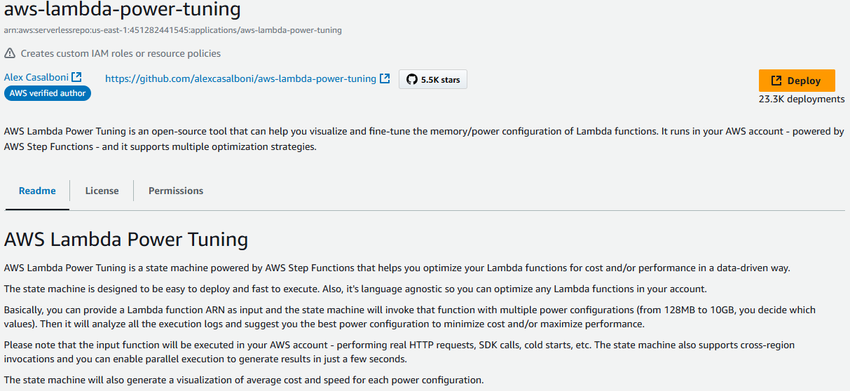 기능에 적합한 메모리 구성을 찾으려면 오픈 소스 AWS Lambda Power Tuning 도구를 사용하는 것이 좋습니다. 이 도구는 AWS Step Functions를 사용하여 서로 다른 메모리 할당에서 Lambda 함수의 여러 동시 버전을 실행하고 성능을 측정합니다. 입력 함수는 AWS 계정에서 실행되어 라이브 HTTP 호출 및 SDK 상호 작용을 수행하고 라이브 프로덕션 시나리오에서 예상 성능을 측정합니다. 또한 이 도구를 사용하도록 CI/CD 프로세스를 구현하여 배포한 새 기능의 성능을 자동으로 측정할 수 있습니다.