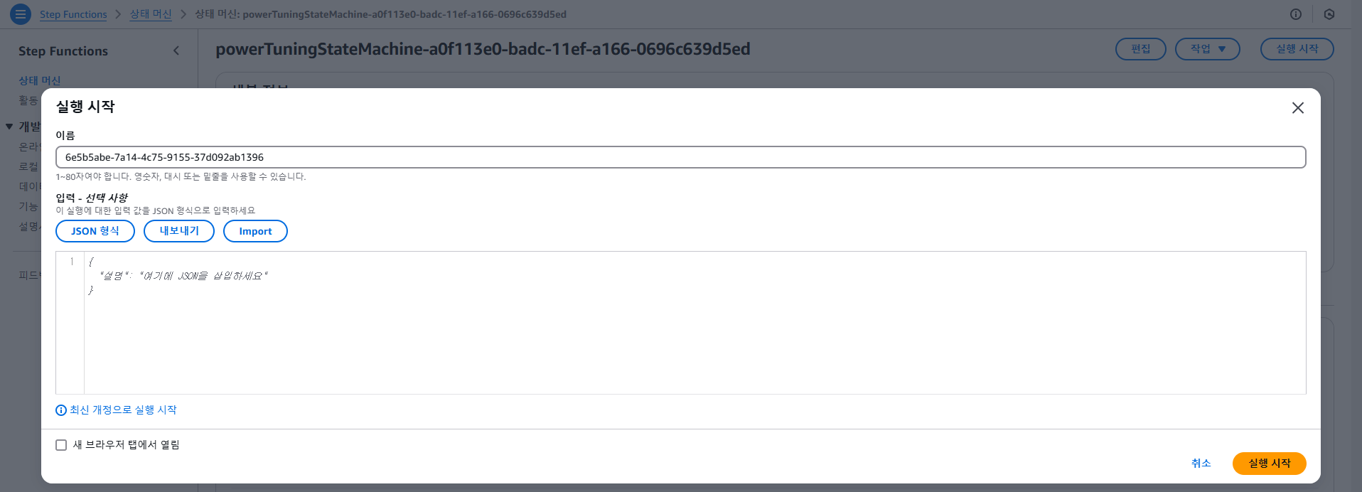 4. 우측 상단에 실행 시작을 클릭하고, 아래 형식으로 JSON을 입력합니다.
