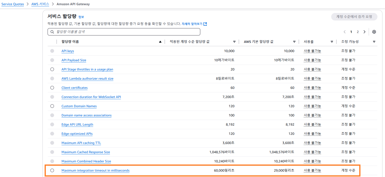 정확하게 필요한 메모리를 측정하기 전에 일단 production 환경에서 Timeout이 나지 않도록 제한 시간을 늘렸습니다. 기본 lambda 웹 콘솔에서는 29000ms로 제한되어 있지만 Service Quotas에서 최대 할당량 값을 계정 수준에서 증가 요청하면 즉시 할당량을 상승 시킬 수 있습니다.