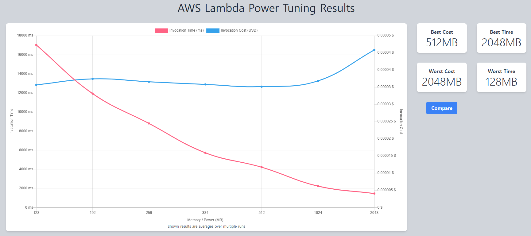 해당 프로그램은 512MB로 메모리를 설정했을 때, 4초 정도 실행 시간이 소요되고 비용 최적화가 된다는 것을 확인할 수 있었습니다. aws-lambda-power-tuning를 사용하여 예산과 UX에 맞는 효율적인 의사 결정을 하는데 도움을 받을 수 있었습니다.