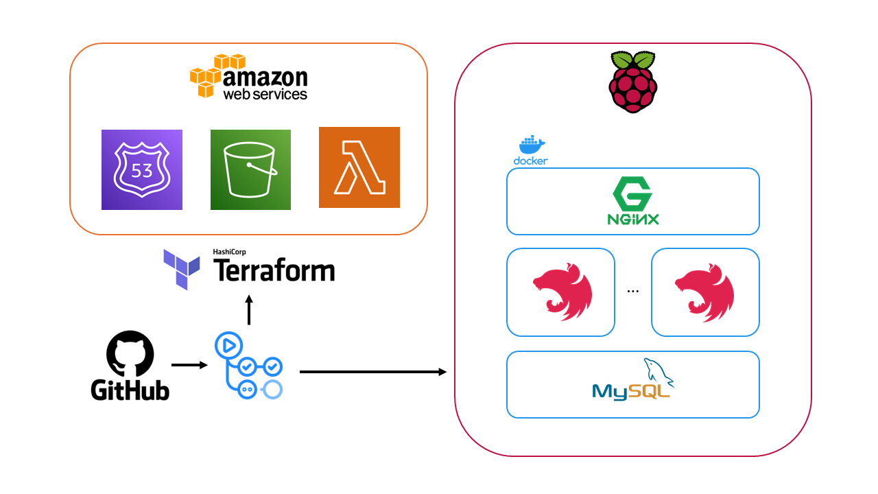 지난 1편에서 라즈베리파이 서버를 설치하고 네트워크 구성했고, 이어서 Nginx, MySQL, WAS(NestJS)를 Docker를 이용하여 구성하고 전 과정을 코드로 관리하여, Github Actions로 자동화까지 해보겠습니다.