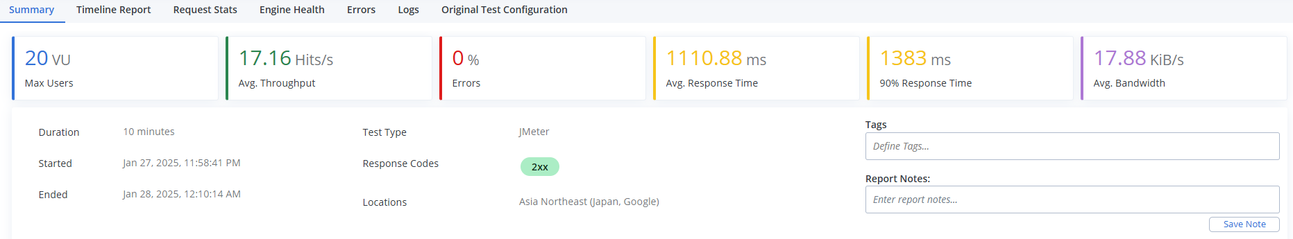 20명 user로 10분 동안 Apache JMeter로 API 테스트를 진행해 본 결과 아래와 같다. (DB에서 게시물 하나를 조회하는 API, Asia Japan 리전에서 접속)