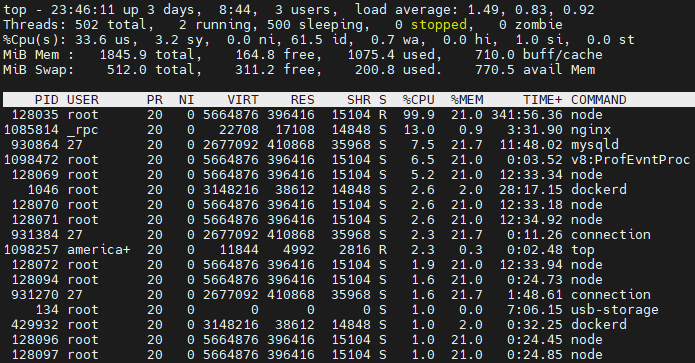 홈 서버에서 top 명령어로 확인해 본 결과에서 us, sy 합인 CPU 사용률이 35~45% 정도 왔다 갔다 하고,