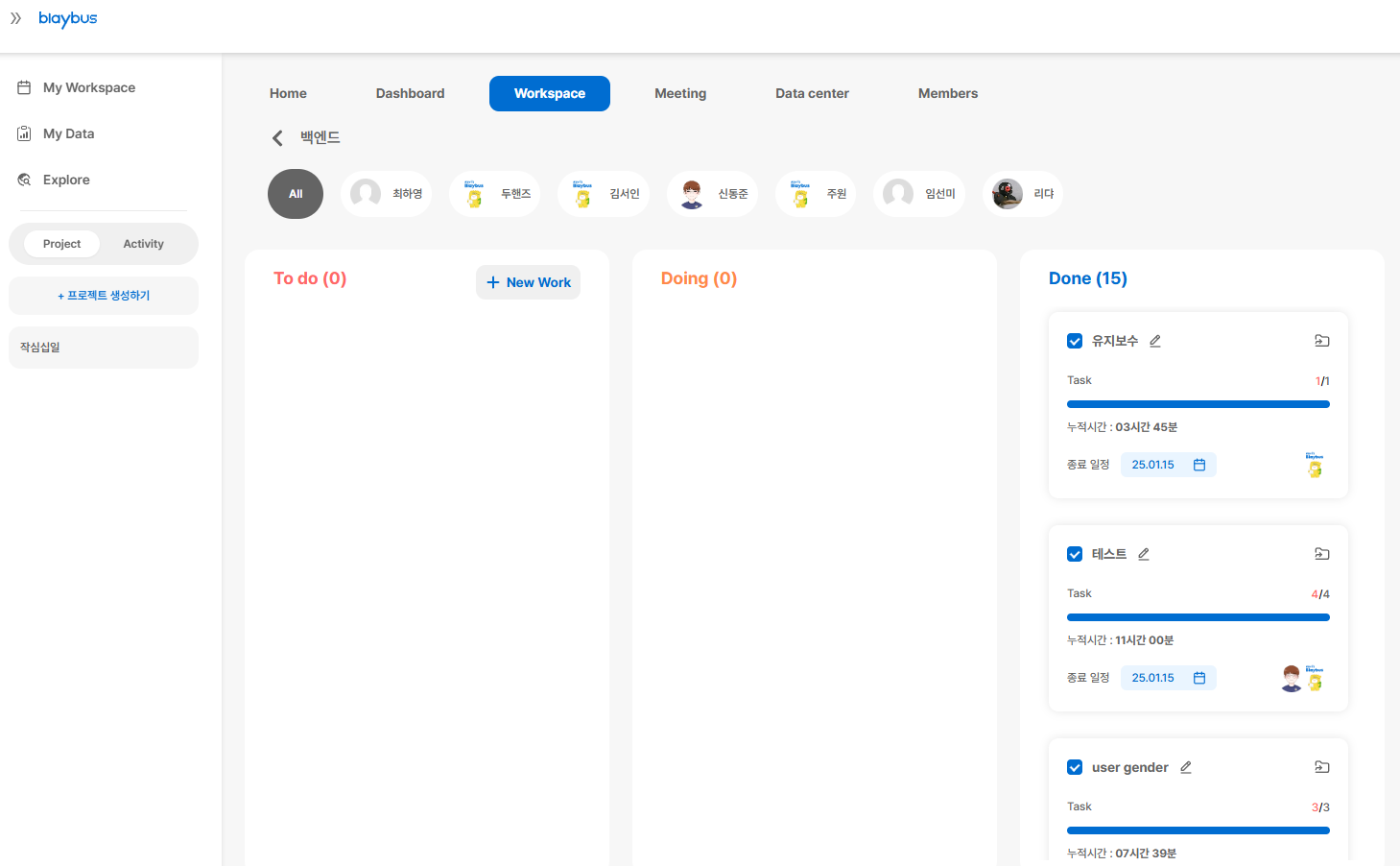 주최 측에서 제공되는 협업 툴을 사용해야 하는 규정이 있었는데, Jira/Asana 같은 느낌으로 에자일 하게 협업할 수 있는 툴이었다. 다른 툴과 달리 내가 실제로 일한 시간을 기록하고 팀원들과 비교해 볼 수 있는 게 특징이었는데, 서로 진행 상황을 보면서 더 자극을 받아서 개발할 수 있었다.