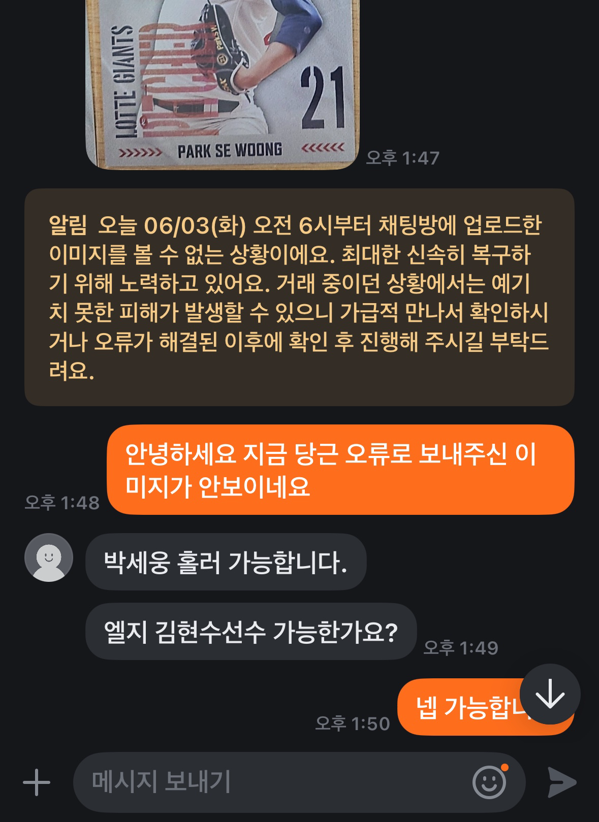 특히 이 발표는 더욱더 인상 깊게 봤던게, 이때와 동일한 이슈인지는 모르겠지만 당근마켓에 이미지가 되지 않을 때 내가 유저로서 당근을 썼던 것이다. 발표를 보다가 생각나서 채팅을 찾아보니, 올해 6월에 한창 야구에 미쳐서 카드 모을 때 있었던 일이었다.