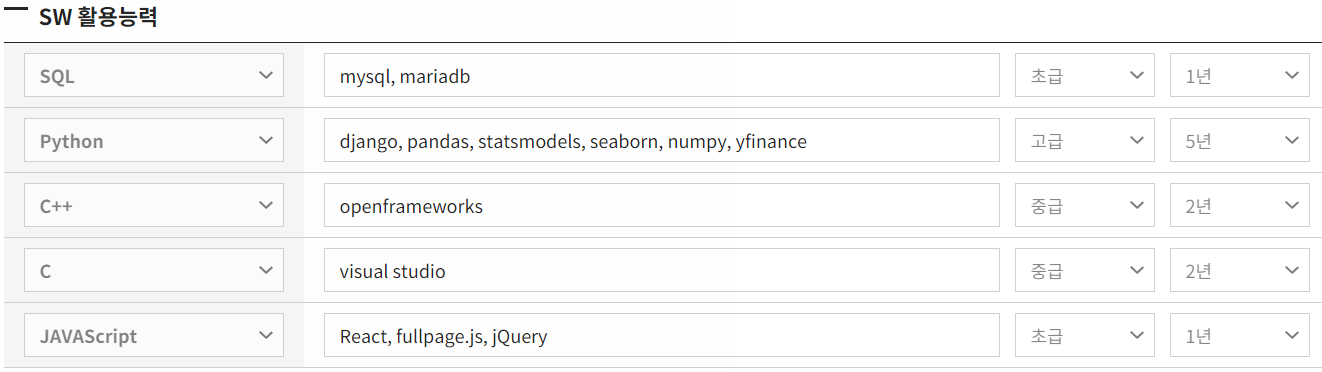 - SW 활용능력은 위처럼 쓸 수 있는 언어 종류, 라이브러리/프레임워크, 본인 평가, 기간 을 기입하면 된다.