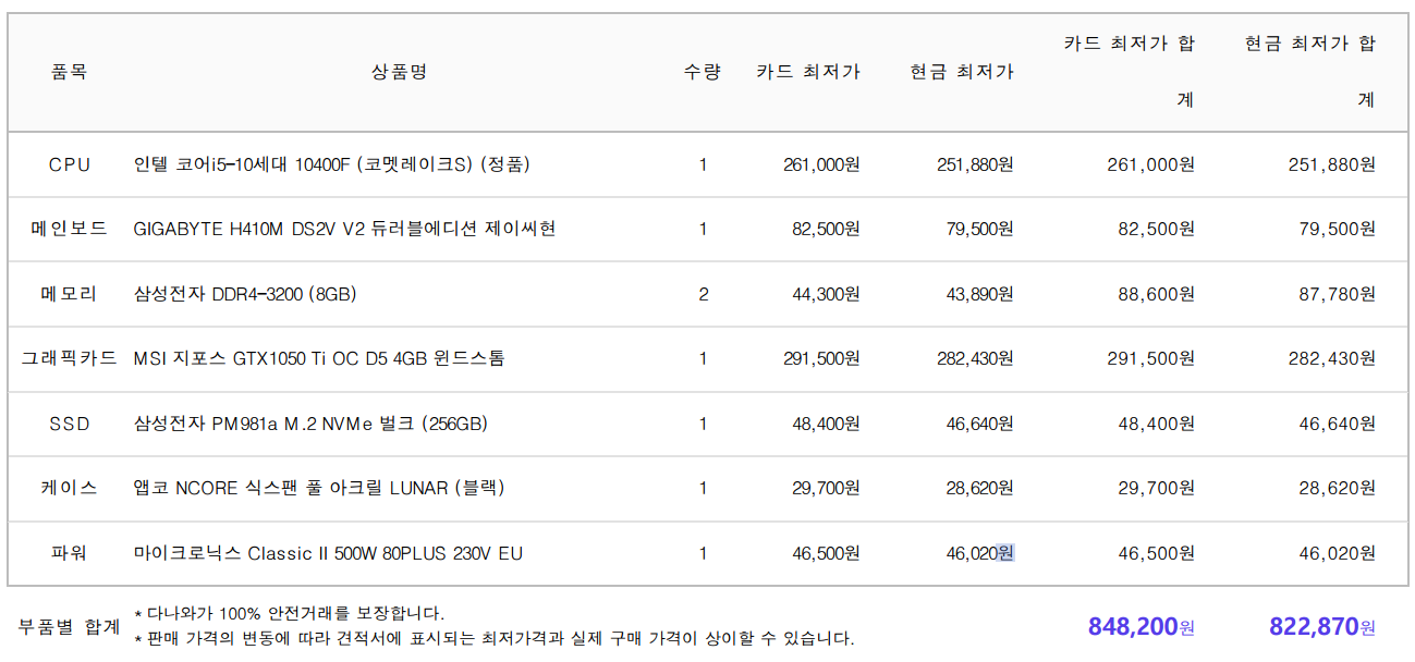 이렇게 하면 시세가 좋을 때(다나와 기준, 컴퓨터 부품 가격은 횟값이라 일주일만 지나도 몇만원씩 가격차이가 난다) 80만원에 맞출 수 있다. 서울 올라갔을 때 더 가격이 떨어지면 좋겠지만 그래픽 카드랑은 좀 더 고민해봐야겠다 ㅡㅡ