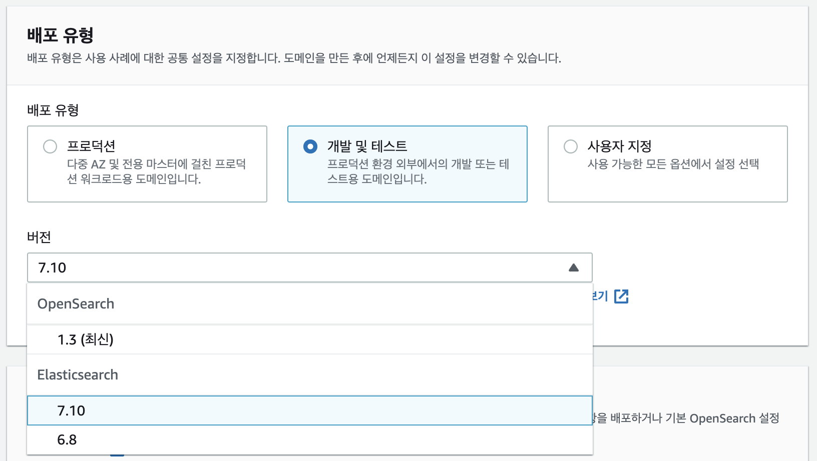 2. 배포 유형을 선택해준다. 본인은 opensearch 대신 elasticsearch 7.10 (AWS에서 지원하는 최신버전)을 사용하였다.