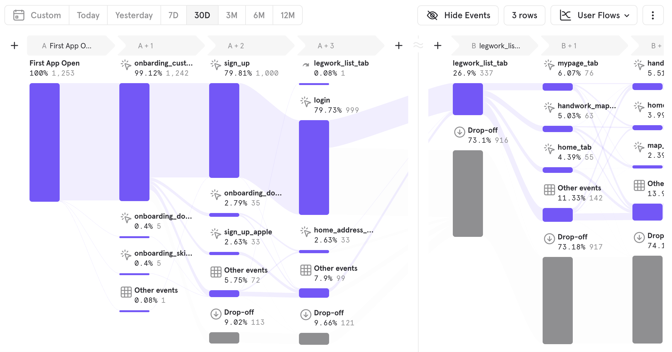 아래의 예시처럼 사용자가 앱을 열었을 때부터 특정 시점에 도달할 때까지 어느 시점에서 유저가 빠져나가고, 어떤 플로우를 거쳐 도착하는지를 분석하고, 이를 토대로 의사결정을 하게 됩니다.