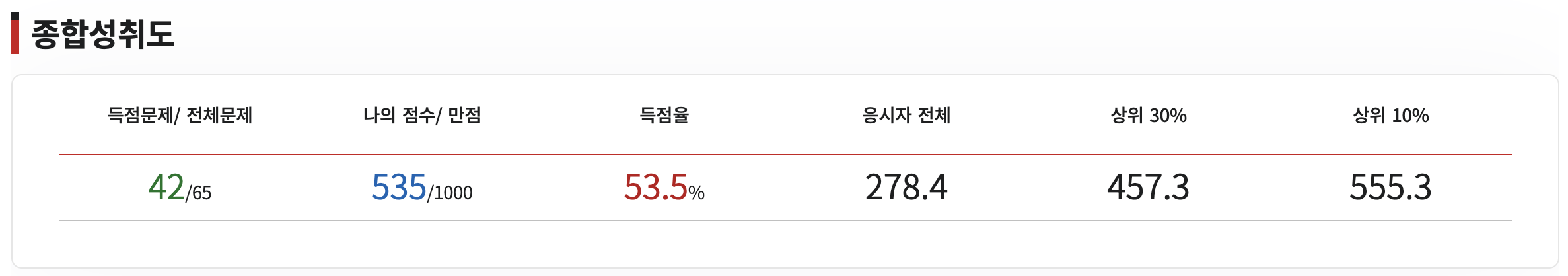 10월달에 칠 때도 집중적으로 준비는 하루정도하면서 Essential만 싹 훑어보고 쳤는데도, 그동안 6개월 프로젝트하면서 쌓인 내공이 생겼는지 꽤나 만족할 정도로 점수가 나온것 같네요. 소마 내에서 점수 반영비가 어떻게 될지는 잘 모르겠지만... 반타작은 쳤지 않을까 생각해봅니다.