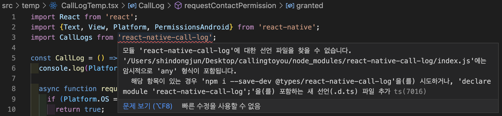 react-native-call-log 라는 통화기록을 가져올 수 있는 react-native 패키지를 사용하다가 아래와 같은 에러를 만났다.