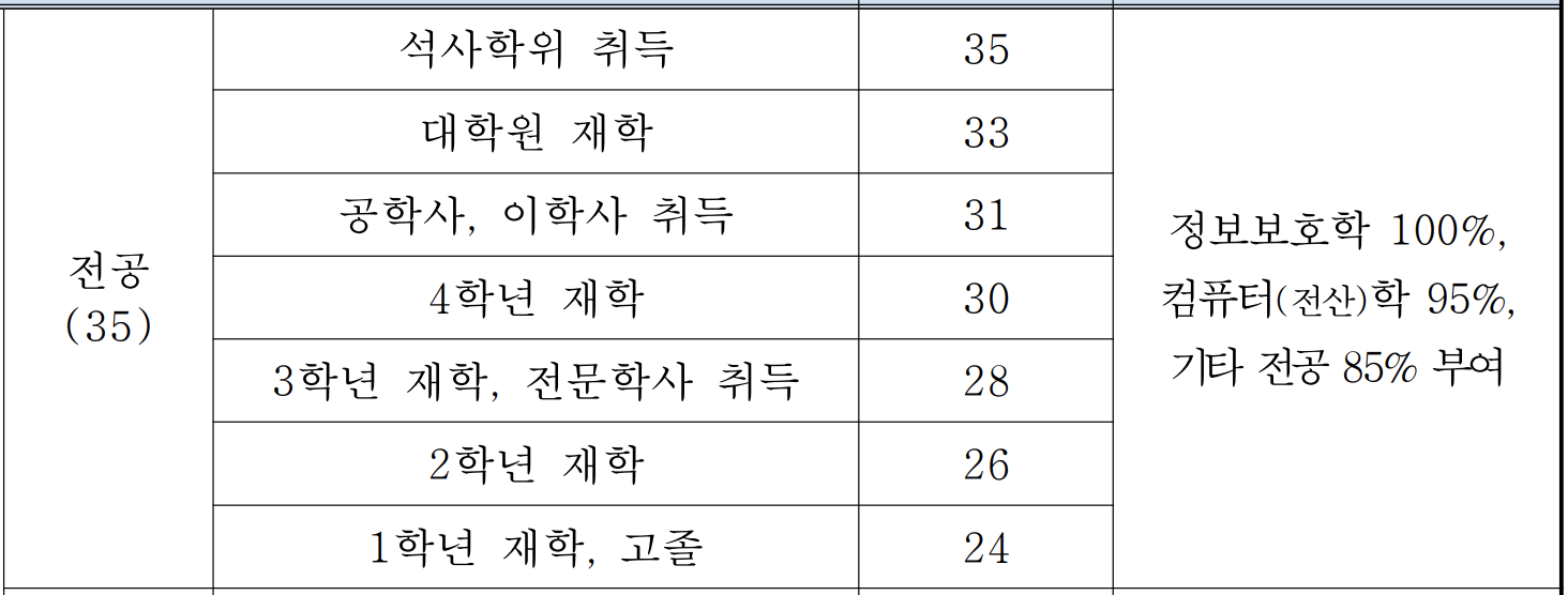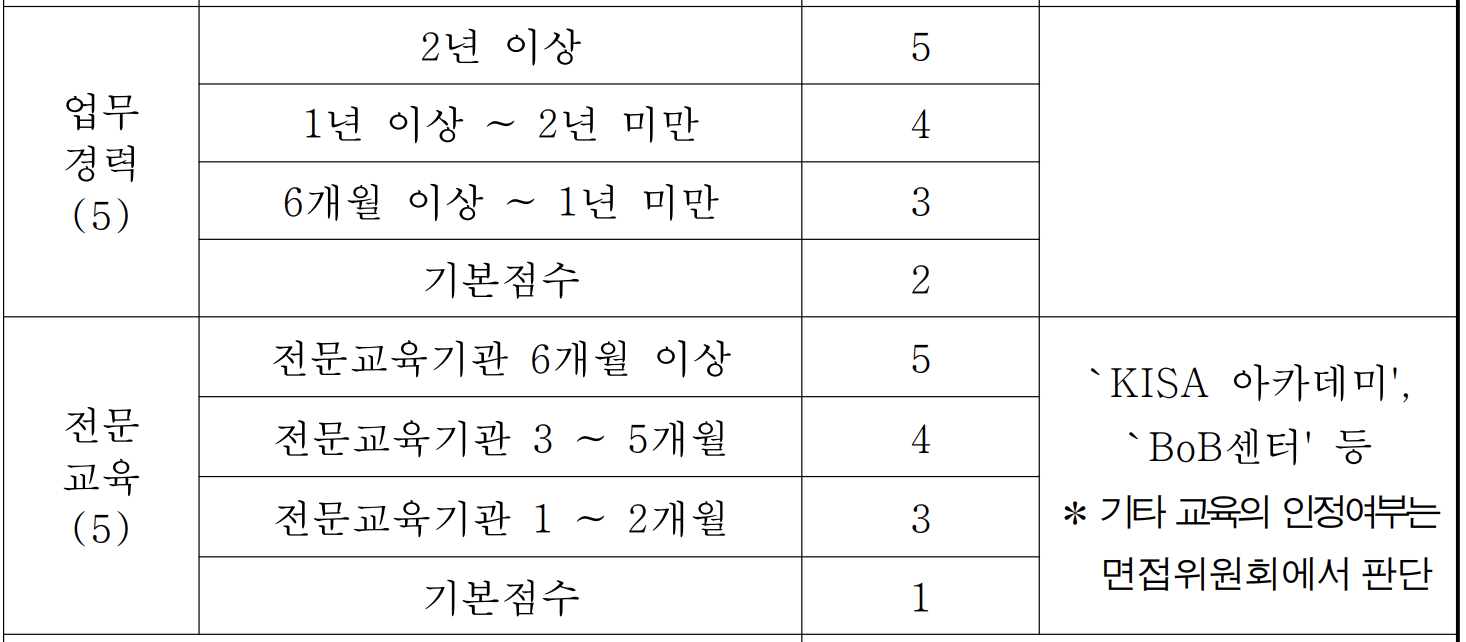 마지막으로 업무경력과 전문교육인데, 이걸로 점수를 받는건 천상계가 아닐까 생각된다. 대학생이 이걸로 점수를 받으려면 정말 간혹 BoB정도 하고 지원하시는 분들이 있을듯 하긴한데, 다른거에 비해 점수편차가 크진 않고, 어짜피 이걸로 점수를 따고 지원했을 정도면(다른 것도 점수가 높을테니...) 그냥 TO가 하나 줄어든다 생각해야지 딱히 경쟁상대가 아니니... 패스