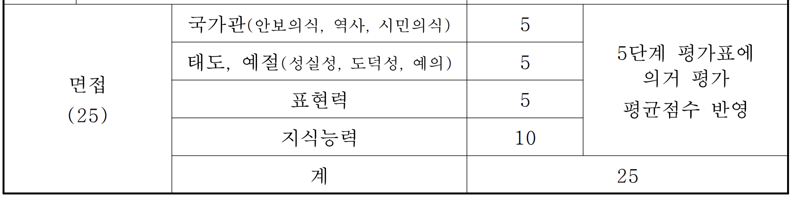 2차 면접에서는 국가관, 태도, 표현력, 지식능력을 보는데 아마 국가관이랑 지식능력에서 배점이 갈리지 않을까 싶다.