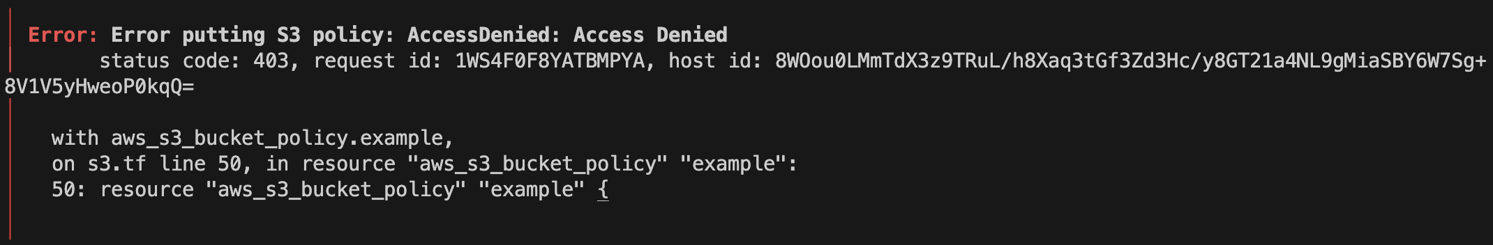 - https://github.com/hashicorp/terraform-provider-aws/issues?q=is%3Aissue+Error+putting+s3+policy