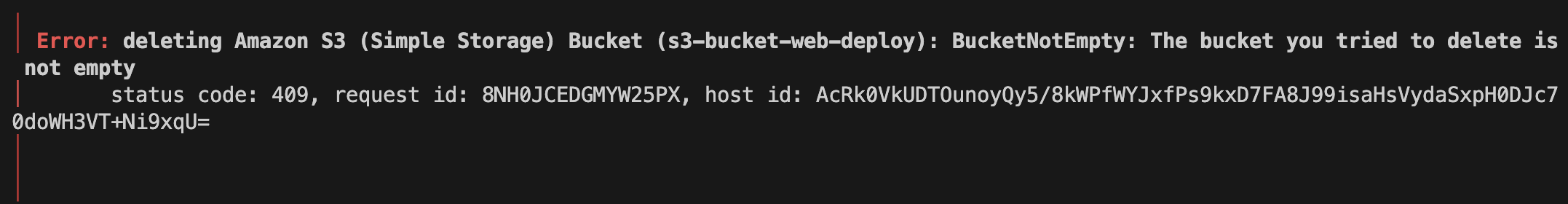 이 부분은 꼭 인지하고 있어야해서 따로 정리해본다. S3 생성시에 'force_destroy = true'를 넣지 않으면 terraform 생성이후 terraform delete 명령어에서 다음과 같은 에러를 만날 수 있다. S3 버킷을 삭제해보았다면 알겠지만, S3 버킷은 기본값이 안에 남아있는 값이 있으면 삭제가 안되게 막혀있다.