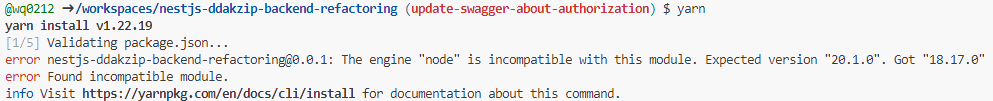 codespaces에서 개발을 하려고 node package를 yarn으로 설치하려고 하는데 node version 에러 메시지가 나왔다.