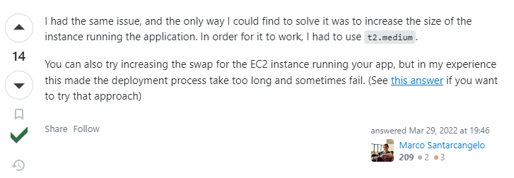 일단은 임시 조치로 Elastic Beanstalk가 사용할 수 있는 EC2 pool을 micro에서 small로 올렸더니 아주 잘 배포되는 모습을 볼 수 있었다... (자본주의로 해결)