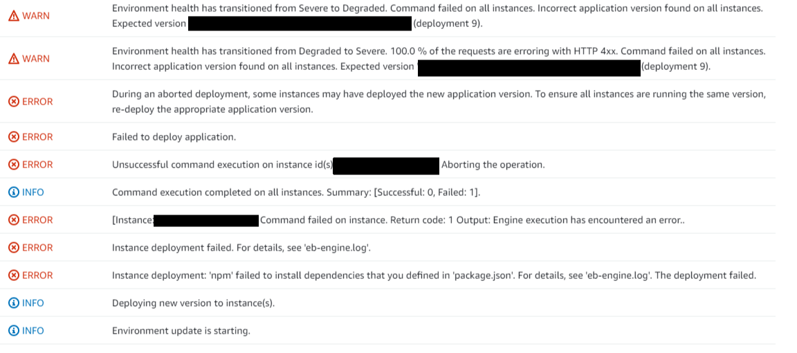 Instance deployment: 'npm' failed to install dependencies that you defined in 'package.json'. For details, see 'eb-engine.log'. The deployment failed.
