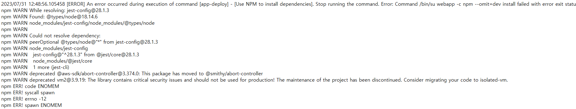 elastic beanstalk 에러 메시지 상으론 npm 설치를 못했다고 eb-engine.log를 참고하라고 나온다.