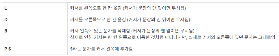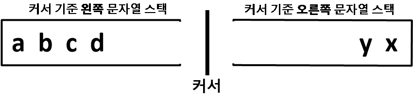 아래의 그림까지만 떠올리면 쉽게 풀 수 있습니다. 커서를 움직인다는 접근보다, 커서는 가만히 가운데 있고 좌우로 글자가 스택에 쌓이는 그림을 떠올릴 수 있습니다. 그러면 각 조건에서 어떻게 동작해야할지 명확히 이해할 수 있습니다.