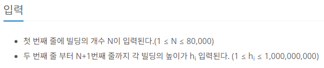 문제 도시에는 N개의 빌딩이 있다. 빌딩 관리인들은 매우 성실 하기 때문에, 다른 빌딩의 옥상 정원을 벤치마킹 하고 싶어한다. i번째 빌딩의 키가 hi이고, 모든 빌딩은 일렬로 서 있고 오른쪽으