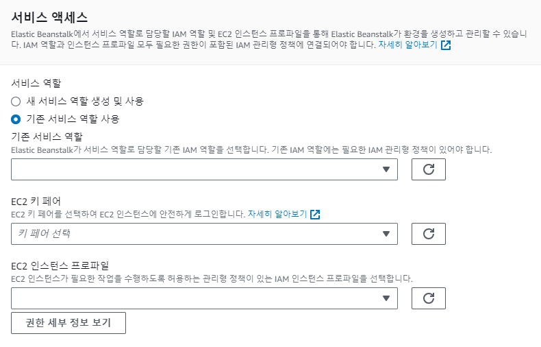 Web Console로 EB를 생성하면 아래와 같은 화면을 볼 수 있다. 이때 '새 서비스 역할 생성 및 사용'을 선택하게 되면 자동으로 EB에 액세스하고 관리하는데 필요한 역할이 부여된 IAM을 생성하게 된다.